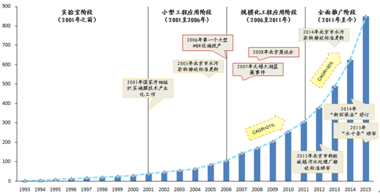 经过 50 年的发展,中国分离膜产业已经逐渐从稚嫩走向成熟。最近 15 年是整个行 业的高速增长期,行业总产值(指膜制品、膜组件、膜附属设备及相关工程的总值) 从 1993 年 2 亿元上升至 2015 年的 1000 亿,按占比 85%计算,2015 年膜法水处理 行业产值为 850 亿。国产膜材技术逐渐成熟,价格下降,同时伴随着 环保标准日趋严格和民众环保意识增强,膜法技术在全国多地开始商业化应用,目前全国投运或在建的万吨级 MBR 城镇污水处理系统已达上百个。