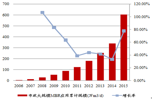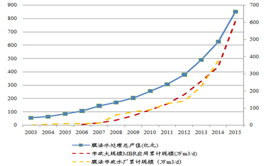 市政大规模 MBR 应用和膜法市政水厂规模变化与膜法水处理行业产值变化趋势高度一致