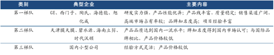 国内膜法水处理行业公司可划分为国际领先企业,国内领先企业和国内小型企业三个梯队